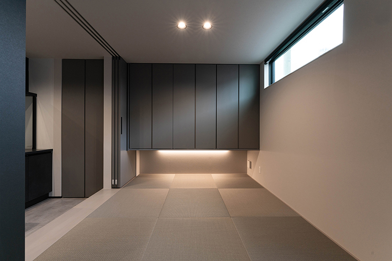 和室には間接照明の付いた吊り押入れで空間に広がりが生まれ、落ち着いた雰囲気をさらに高めてくれる