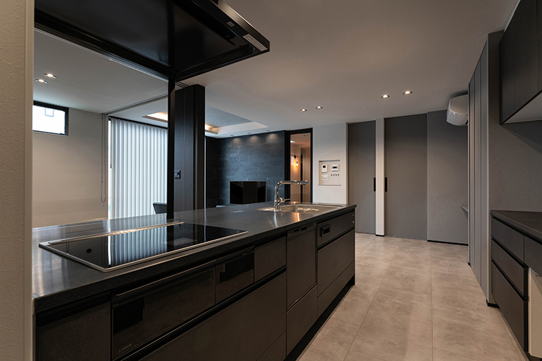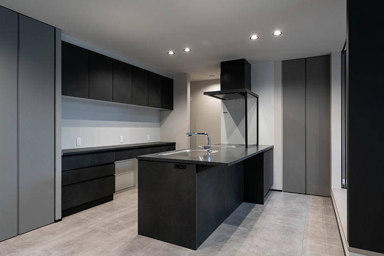 ブラック×グレーのコントラストが映えるキッチン。フラットな面構成とシャープなラインが、空間に凛とした美しさを添える