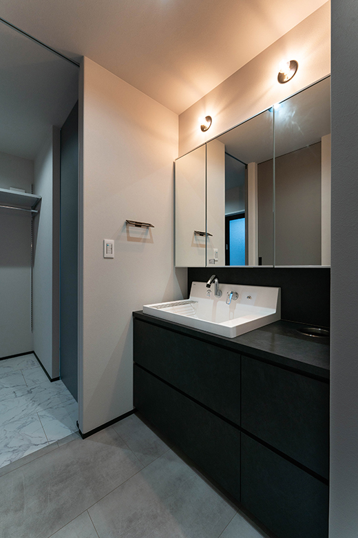 玄関ホールからすぐの所にある洗面スペースは独立しているので来客にも使いやすい。ダストシュート付きでホテルライクな洗練された空間に
