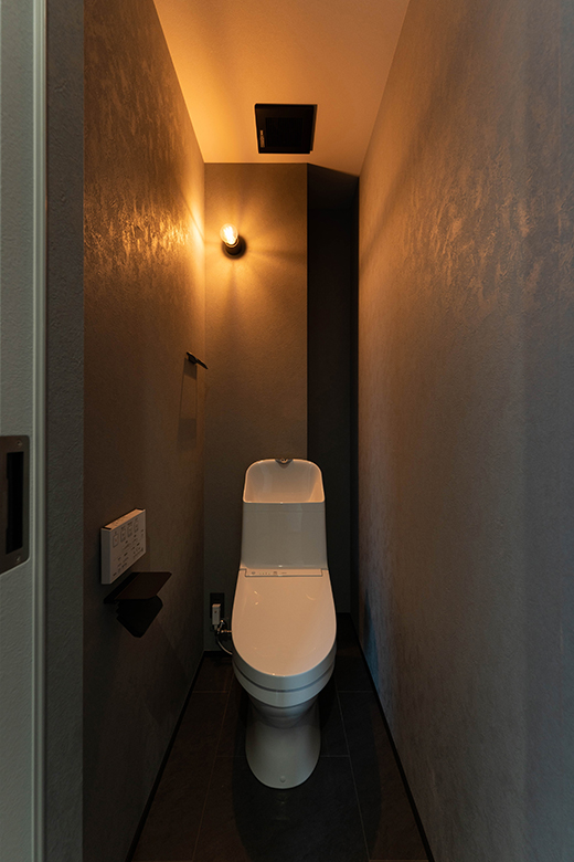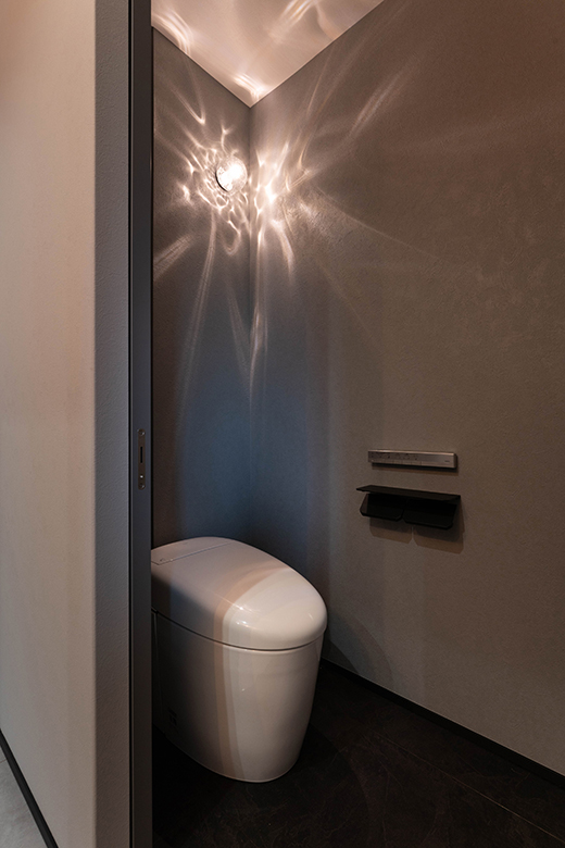 壁に映る光の表情が際立つラグジュアリーなトイレ空間。ブラックスレート柄のフローリングが高級感を醸し出す