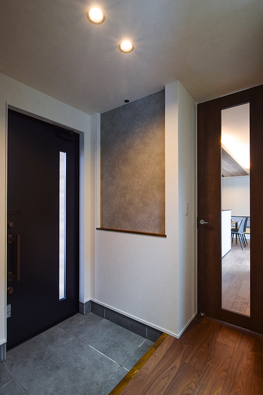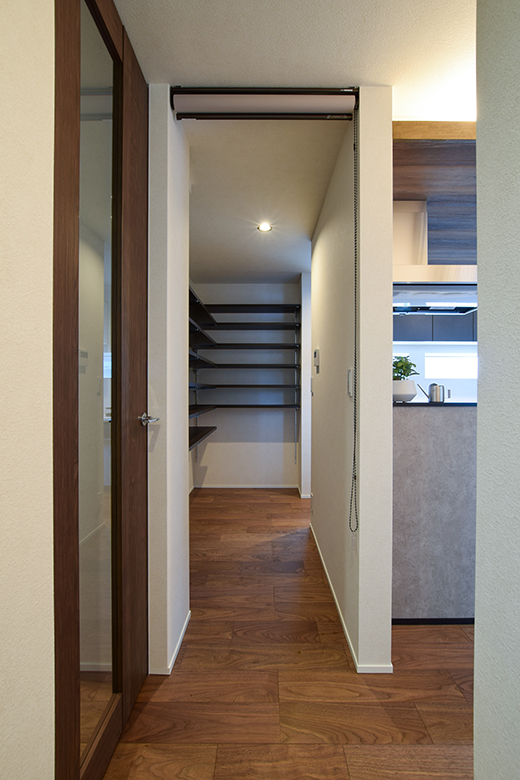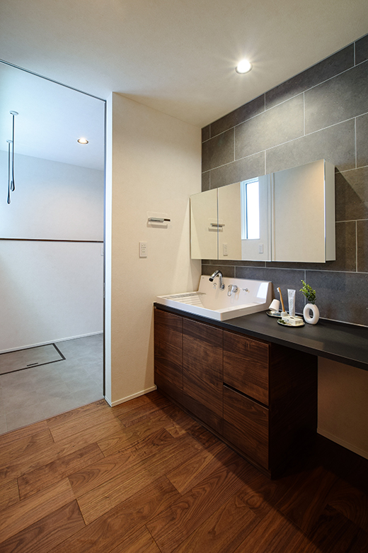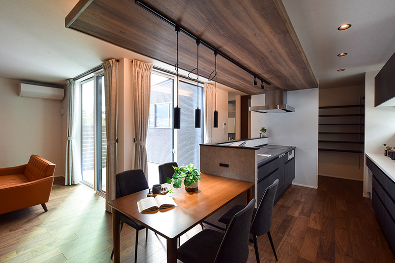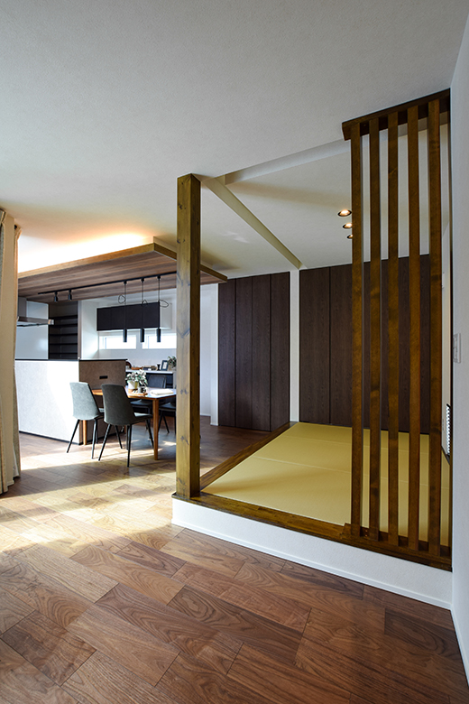 ウォルナット材の深い色合いと落ち着いた雰囲気が、空間に静けさと温もりをもたらす。