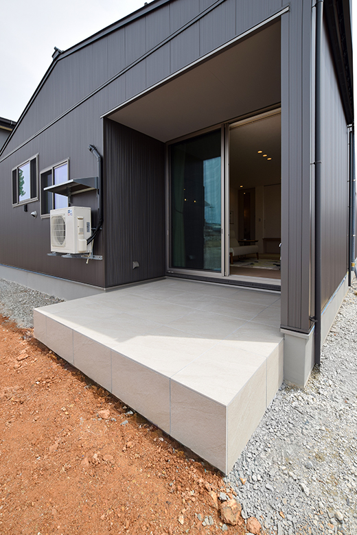大開口サッシからつながる屋根付きテラスが、開放感あふれる心地よい空間を演出。