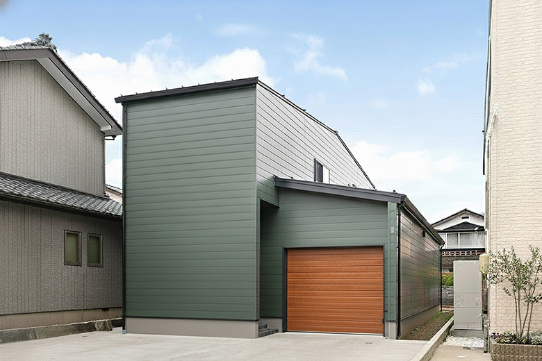 水平ラインを強調したシンプルな箱型フォルム。インナーガレージを一体化し、グリーン外壁と木目シャッターが映える外観デザイン
