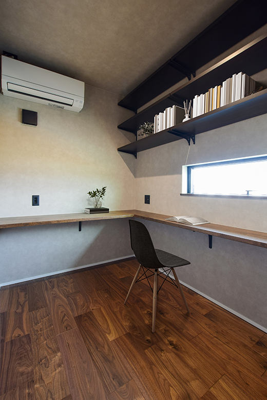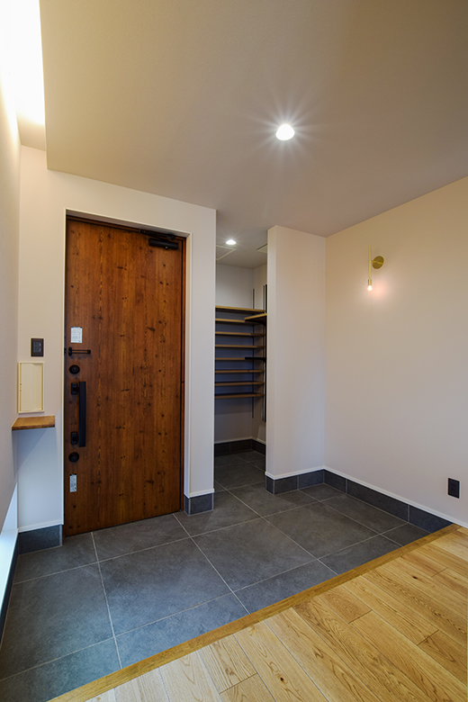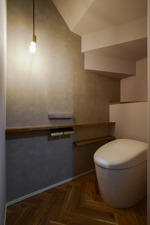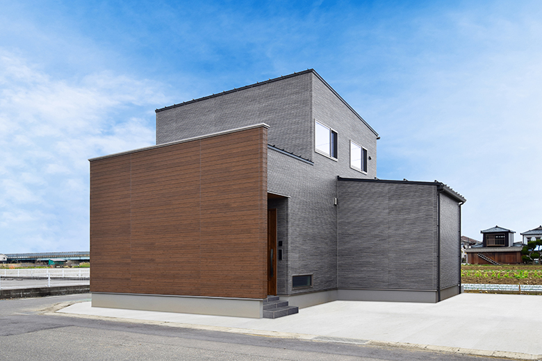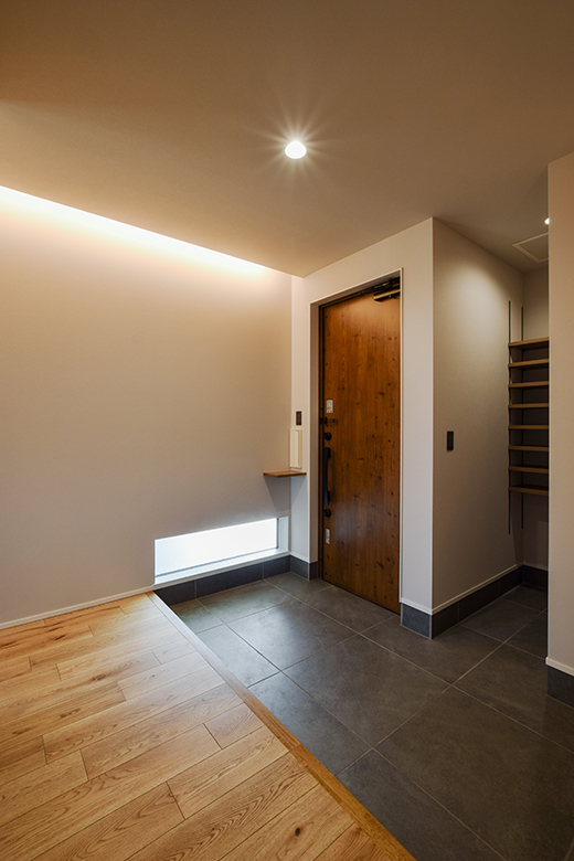 オークの温もりとグレーの落ち着き、勾配天井で広がる8の字回遊動線の家|燕市|T様邸