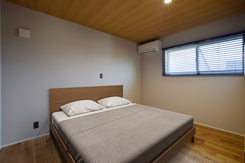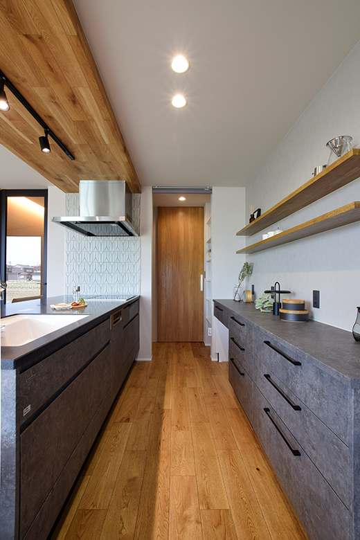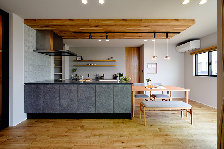 オーク材の温もりが広がる空間に、グレーの落ち着いた色調を組み合わせた、シンプルで洗練されたデザイン。