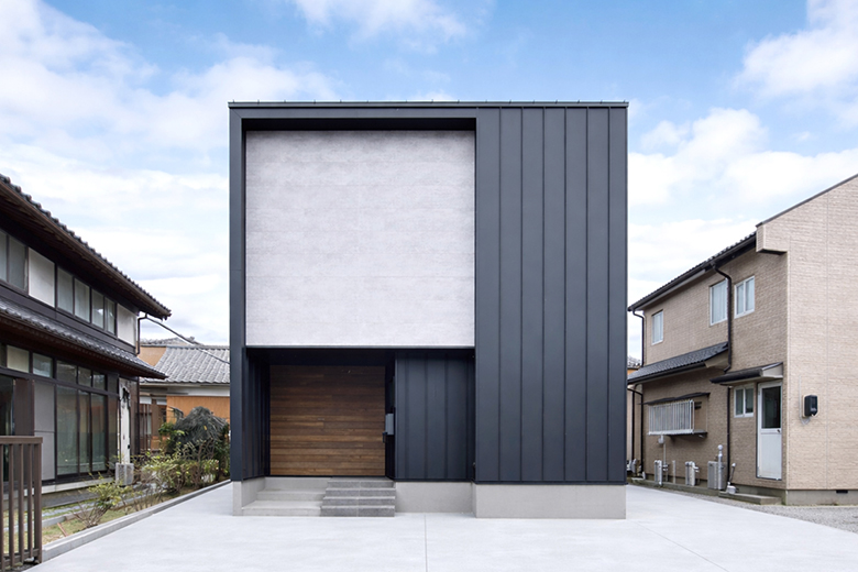 外観はガルバリウム鋼板の縦ハゼを基調に、シャープでスタイリッシュな印象に仕上げ、内装はシンプルで上質な雰囲気に。
