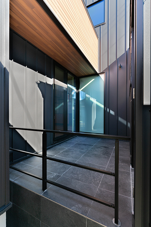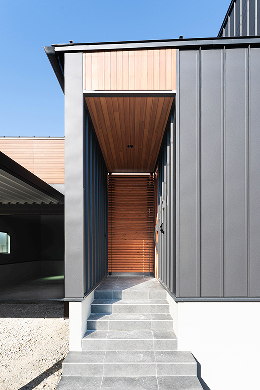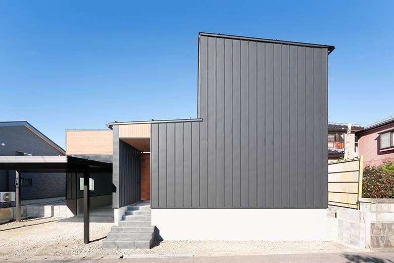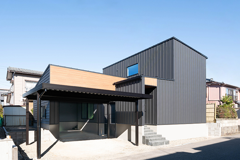 市街地で建ぺい率の制限がある中でも、インナーガレージとカーポートを併設し、限られた条件の中で理想のプランを実現。