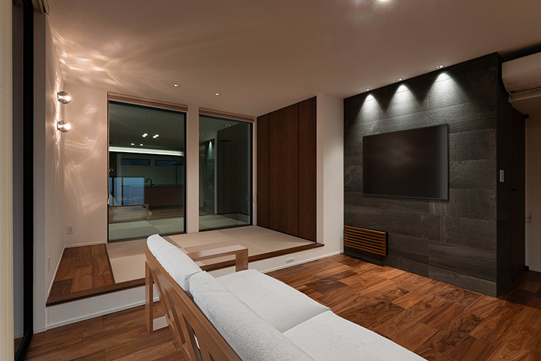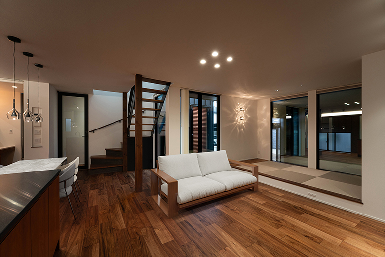 リビングにいながら愛車を眺められる贅沢な時間を堪能できる住まい。