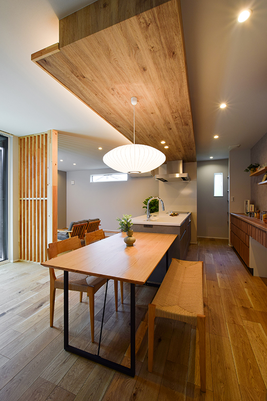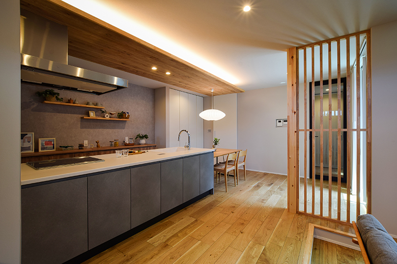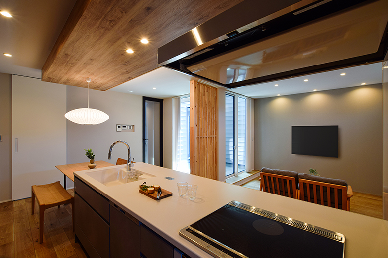 キッチンからは、ダイニング・リビング・テラスまでを一望でき、家族の気配を感じながら快適に過ごせる。