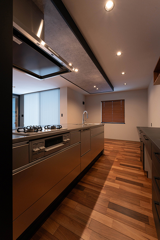 存在感のあるステンレス風キッチンを配置し、料理を楽しみながら会話が生まれる、暮らしの主役となる場所。