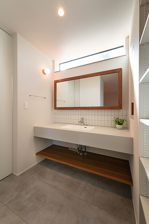 家事動線は広く作りすぎずシンプルにまとめ、幅広で使いやすい洗面台にもこだわった。