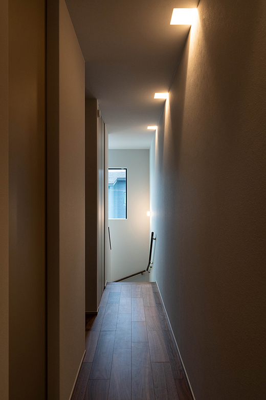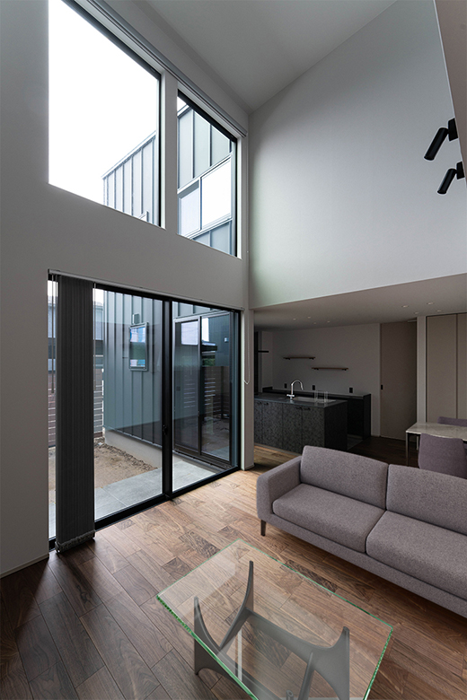 中庭をフェンスで囲うことで、外部からの視線を遮りながらも、吹き抜けを通してやわらかな自然光が住まい全体に広がる明るい空間に。
