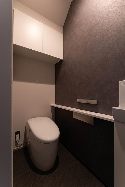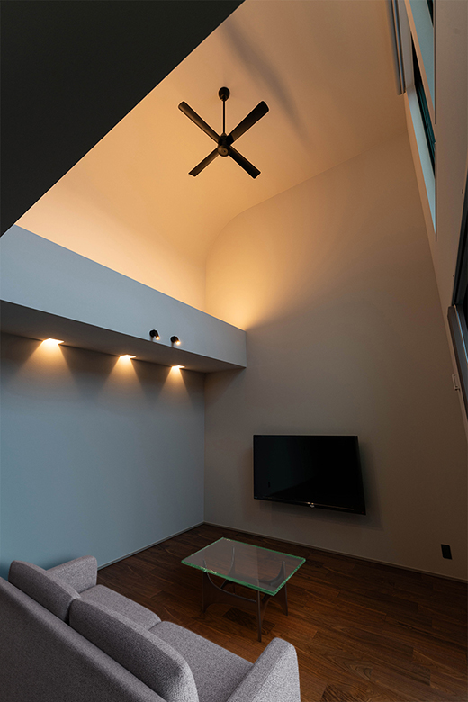 吹き抜けアーチに間接照明のある、ブラックな佇まいの家|新潟市江南区
