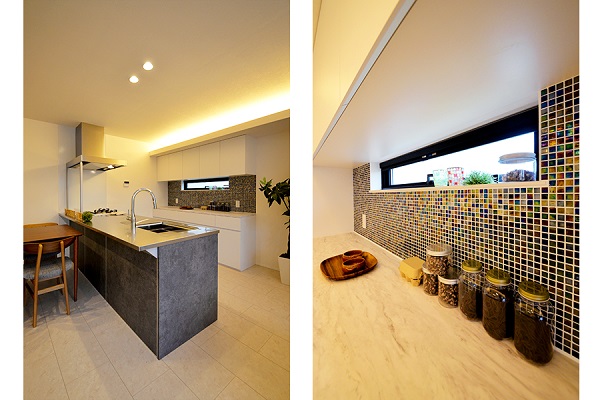 タイル・アイアン・ガラスなど、さまざまな素材が調和した、美しくモダンな印象のLDK。